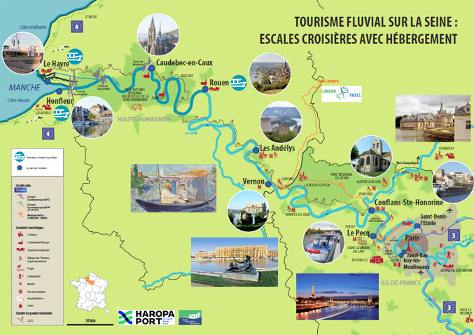 • Les escales classiques : Caudebec-en-Caux, Les Andelys, Vernon, Conflans-Sainte-Honorine, Le Pecq, Saint Denis, Issy-les-Moulineaux. Elles constituent des zones d’accostage généralement situées à proximité de destinations touristiques phares.